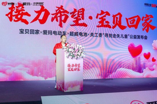 超威集团联合宝贝回家、爱玛电动车、长兴关工委发起的[接力希望•宝贝回家 ——宝贝回家×爱玛电动车×超威电池“寻找走失儿童”]的公益爱心活动 ,面向全国发动将3000多位超威代理商、上万家爱玛电动车门店、300000家终端维修店合作网点,通过每年销往全国的上亿只电池一起关注和寻找走失儿童。每一只深入到全国的大街小巷、遍布及大小乡村的超威电池上,都贴有寻找走失儿童的信息。每多卖出一只电池,就多一份找回走失儿童的希望。