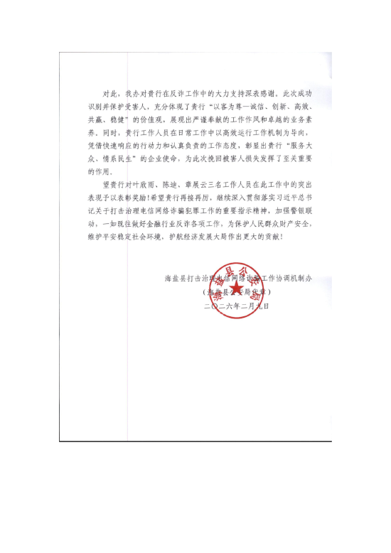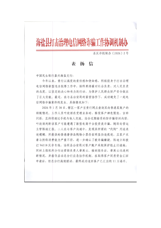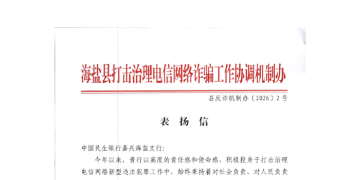 关注春节后开工首日,民生银行嘉兴海盐支行收到了嘉兴海盐县反诈中心送来的一封表扬信。信中,嘉兴海盐县反诈中心对支行在1月底成功拦截一起境外电信诈骗案件给予高度评价,并对相关工作人员予以表彰奖励。