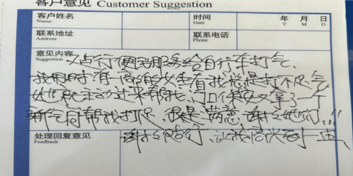 据了解,这位客户到网点使用便民服务设备为电动车充气时,因操作问题始终无法顺利充气。网点工作人员发现后,立即主动上前提供帮助,不仅协助其及时完成充气,还贴心为客户递上暖心饮品。客户在意见单中写道:““建行便民服务给自行车打气,我用时,有一高个的女生看我总是打不进气,她就主动过来帮我,门口保安又拿了一个新气筒帮我打进,很是满意,谢谢她们,谢谢建行,让我高兴到一点”。质朴的话语,道出了对网点细致服务的由衷感谢。