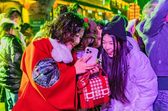 在漫天飞舞的“雪花”中打卡拍照,这是独属于慈城的冬日浪漫。