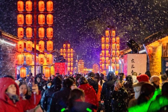 从大东门瓮城的爱心气膜雪景,到民权路街区的持续浪漫造雪,古城银装素裹。