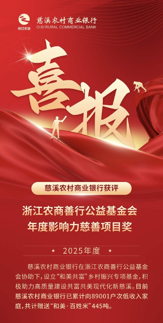 喜报 | 慈溪农村商业银行获评浙江农商善行公益基金会年度影响力慈善项目奖 商讯 04月22日 16:55 关注 确定不再关注此人吗 摘要: 慈溪农村商业银行在浙江农商善行公益基金会协助下,设立“和美共富”乡村振兴专项基金,积极助力高质量建设共富共美现代化新慈溪。目前慈溪农村商业银行已累计向89001户次低收入家庭,共计赠送“和美·百姓米”445吨。 分享文章到:
