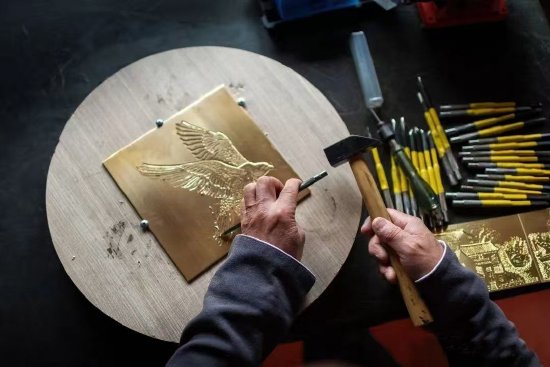 绍兴铜雕有凿刻、铸造、锻打、文创制作(数控车床)四大门类,各门类都有专属工具与技法。我在工艺上打破了传统铜雕的单一表现形式,将器物的“阳雕”与平面的“阴刻”工艺结合,大幅提升作品的层次感与变化感;还融入石雕“劈、铲、剁”技法,哪怕是毫米厚的铜板,也能雕出传神的人物、花鸟、山水,一幅作品往往要敲打几十万下,稍有不慎铜板就会被戳穿,这靠的都是年复一年的打磨,一步步的摸索创新。