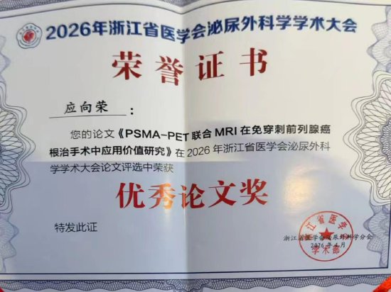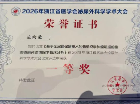 关注4月10日—12日,2026年浙江省医学会泌尿外科学学术大会在丽水缙云隆重召开。本次大会汇聚全省泌尿外科学领域专家学者,共收到投稿394篇,学术交流氛围浓厚。绍兴市人民医院泌尿外科应向荣主任带领团队参会,凭借扎实的临床功底与前沿的科研创新能力,投稿2篇学术论文均获评优秀论文,其中1篇更荣获大会唯一一等奖,展现了科室在省内的领先水平。