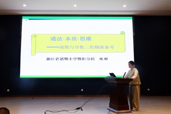 来自诸暨中学暨阳分校的陈彬老师以《通法·本质·思维——函数与导数二轮精准备考》为题,她通过对本次二模考试导数题的一题多解、一题多变,倡导从本质出发,提升学生思维层次。