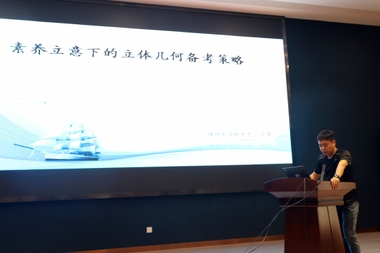 随后来自嵊州市高级中学的金渭老师带来《素养立意下的立体几何备考策略》,他结合新课标,通过高考真题分析,回归教材,以核心素养培养为导向,分析了立体几何的各类解题模型与解题策略。