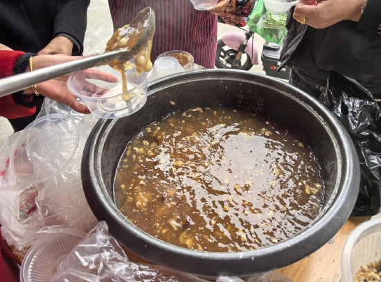 上午9点30分,村部门前已飘起阵阵甜香。银行工作人员将熬煮好的山粉糊分装成碗,妇女主任则带领志愿者们维持秩序,撒上芝麻后,将一碗碗山粉糊递到村民手中。“这糊熬得稠,好吃!”阿婆捧着碗笑得合不拢嘴。活动现场,支行工作人员还为村民普及反诈知识,针对老年群体重点讲解“保健品诈骗”“冒充亲友转账”等典型案例,用方言叮嘱大家守好“钱袋子”。
