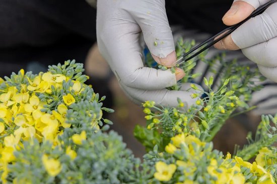 在何道根眼中,繁育基地更像一座无形的“工厂”,每天都在进行着新产品研发与试生产。农艺师高旭从父本取花粉,小心翼翼涂抹在母本柱头上。一个花蕾,一次授粉,一个全新组合就此诞生。这样的动作,他一天要重复成百上千次。