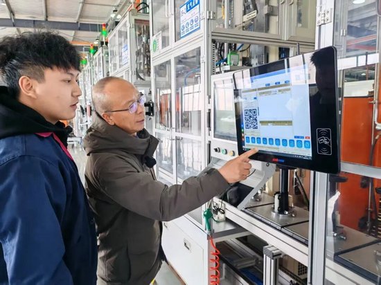 在装配线上,操作工柯书翔掏出胸前的员工卡,在机器感应区轻轻一靠,“嘀”一声,设备随即激活。他俯身看屏幕,指尖轻点几下,输入生产指令,机器缓缓启动,一切从容有序。