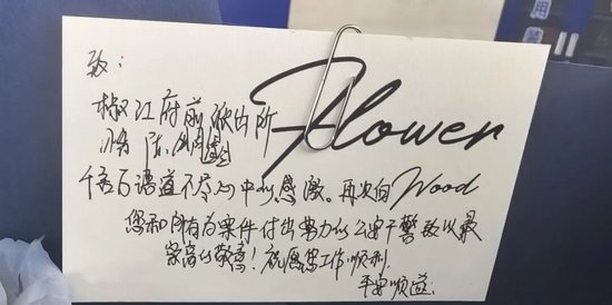 收到退款后,邓某感动不已。她专程来到府前派出所,亲手送上鲜花对陈周鑫表达感谢,花束上还夹着一张写满真挚话语的卡片。卡片上写道:“椒江府前派出所陈周鑫,千言万语道不尽心中的感激。再次向您和所有为案件付出努力的公安干警致以最崇高的敬意!祝愿您工作顺利,平安顺遂。”